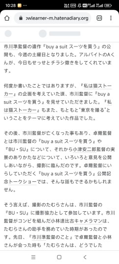 铃木卓尔拍摄的起因是想通过拍猫来展现东京的变化,他发现自己以前很多喜欢的东京的店都慢慢消失不见了,于是将片场范围定在谷根千这一带下町,并集中往根津那块跑,谷根千多为丘陵地形,田村正毅背着个大块头摄像机跑上跑下,几次累到喊罢工。 拍东京自然离不开谈小津、成濑等人,还有熊切和嘉刚开拍的《海炭市叙景》,但他们开拍前聊得最多的,对铃木影响最大的是市川准,特别是《我不买西装》和《丑女》两部。当时恰逢市川准辞世不久,铃木拍摄的过程中还肩负着分发“市川准纪念放映会”传单的任务。铃木本人此前也和市川准合作过,崇尚那种都市中渺小却鲜活笃定的声音。怪不得我看这部电影时会觉得有点市川准的味道,原来和市川渊源颇深。