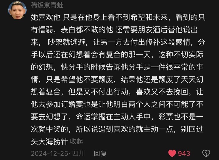 这两个截然不同的观点都是可探讨的 这段感情里面并没有谁对谁错 生活中也是如此 面对关系我们需要勇敢 不能懦弱 但是不一定要时时刻刻被对方左右情绪 我们需要有自己的生活重心 有自己的想法 做自己想做的。感情需要主动选择 主动经营 主动付出 才有可能抵达幸福的彼岸;爱是勇敢者的游戏 勇敢去爱 才能收获璀璨的爱情之花。